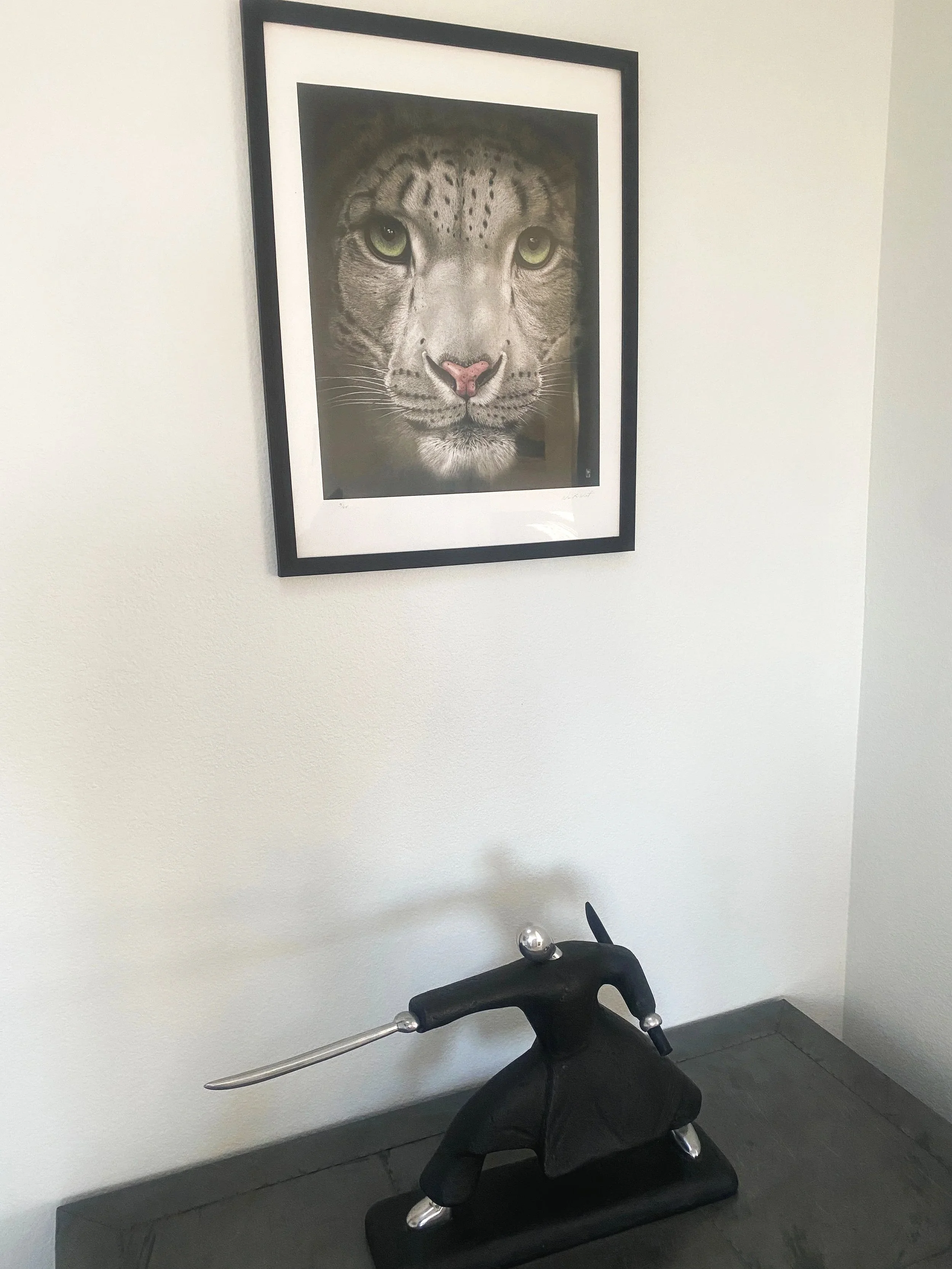 Customer Steve bought the Iberian Lynx frame original first and loved it so much wanted to purchase a framed print of the Snow Leopard. He did a great job of hanging with custom lighting. Nicely done Steve!